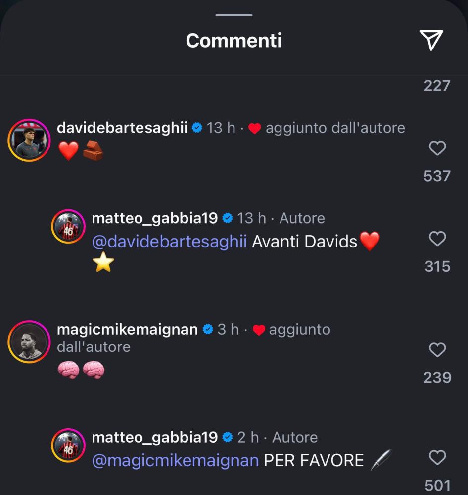 Proprio Mike Maignan è stato uno dei protagonisti in positivo della serata di ieri, compiendo nel primo tempo un vero e proprio miracolo su un colpo di testa di Gila. Inoltre, fatto curioso e particolare, l'estremo difensore francese ha commentato il post Instagram di Gabbia con due emoticon del cervello e il numero 46 gli ha risposto con un semplice: "Per favore rinnova". Messaggio chiaro: tutti vogliono il rinnovo del numero 16, anche se al momento sembra lontano.