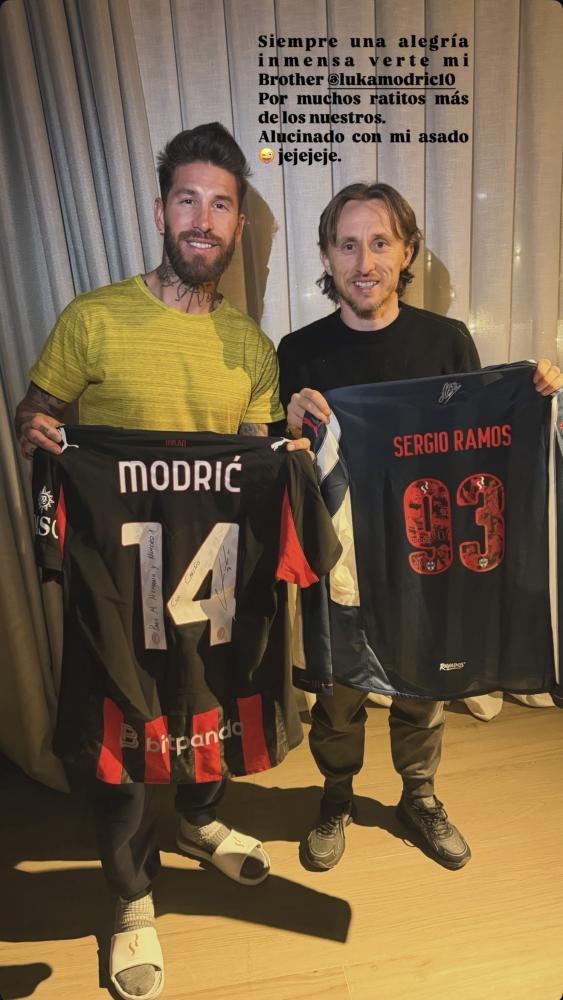I due hanno condiviso per tanti anni lo spogliatoio a al Real Madrid, vincendo tutto quello che si poteva vincere prima con Carlo Ancelotti e poi con Zinedine Zidane. Sergio Ramos ha voluto immortalare questa visita con una foto, con tanto di scambio di maglie, che ha pubblicato in una stories Instagram con tanto di dedica al Luka Modric: "Sempre un'allegria immensa vederti fratello mio. Per altri incontri come questi. Ti ho impressionato con il mio asado ahahahahha":
