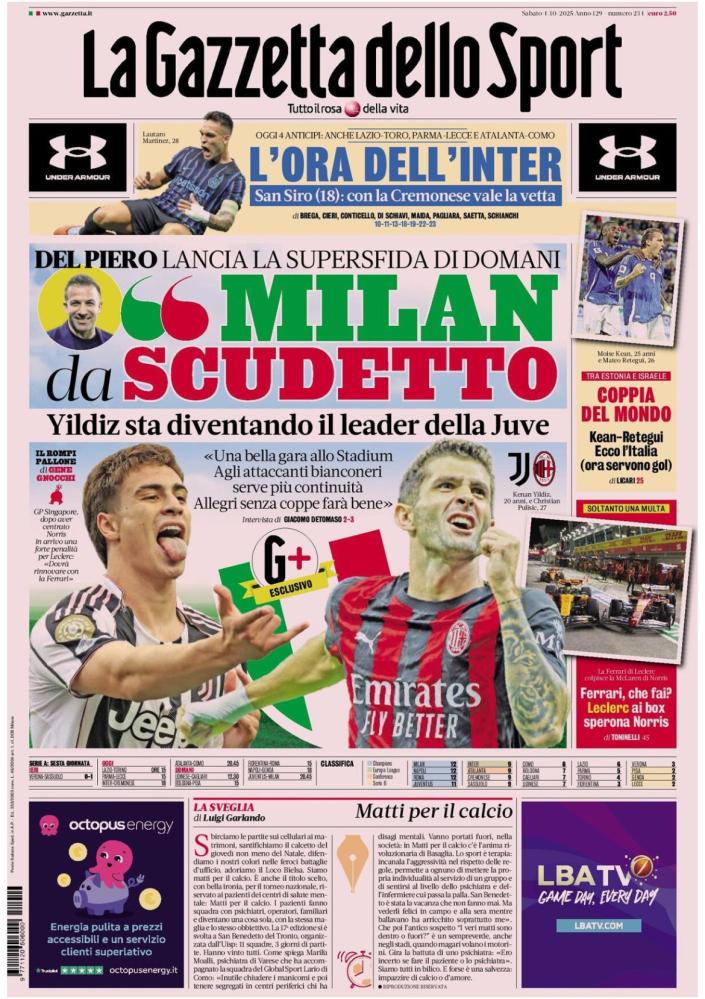 L'edizione odierna della Gazzetta dello Sport apre stamattina in prima pagina con le parole di Alessandro Del Piero, ex attaccante di Juventus e Nazionale: "Milan da scudetto". Questo il suo pensiero sulla formazione di Max Allegri: "Milan già da scudetto? Per una serie di dinamiche sì. Perché gioca solo il campionato e ciò gli permette di preparare la settimana molto bene e di avere giocatori pronti a livello fisico, senza viaggi né intoppi. E anche perché ha qualità, non solo Rabiot, ma anche Modric, Leao, Saelemaekers... È una squadra ben strutturata".