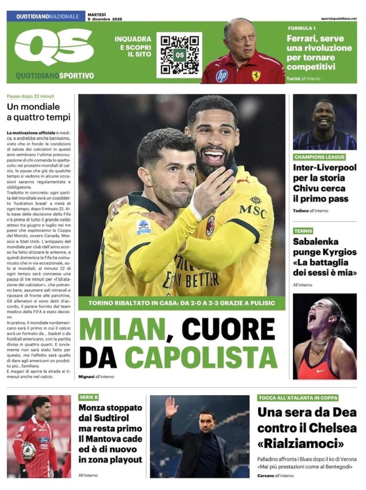 Il Quotidiano Sportivo in edicola stamattina titola così in merito alla rimonta di ieri del Diavolo che, dopo essere stato sotto di due gol, ha battuto 3-2 in trasferta il Torino: "Milan, cuore da capolista". Con questo successo, arrivato grazie alla rete nel primo tempo di Adrien Rabiot e alla doppietta nella ripresa di Christian Pulisic, i rossoneri sono tornati in vetta alla classifica, dimostrando ancora una volta di essere diventati una vera squadra.